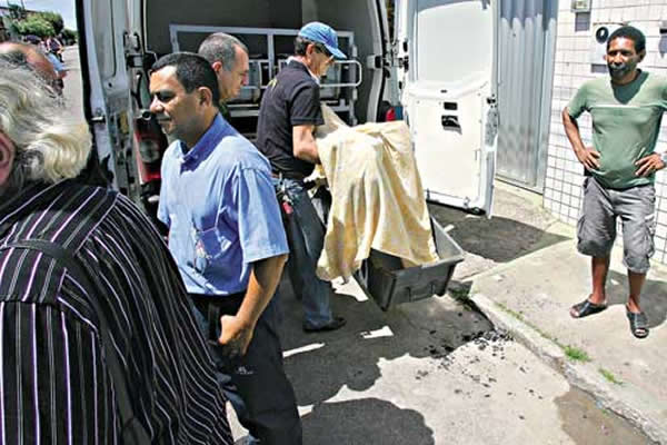 O corpo da menina é retirado de dentro da residência e colocado no rabecão da Perícia Forense logo após a Polícia constatar marcas compatíveis com agressão. A Vizinhança ficou revoltada. A família nega ter havido violência. (Foto: José Leomar)